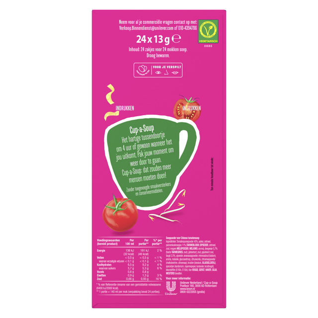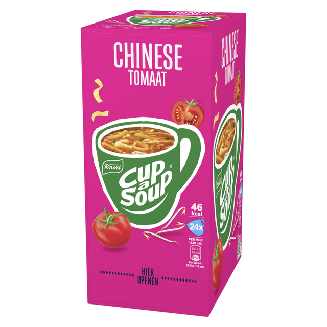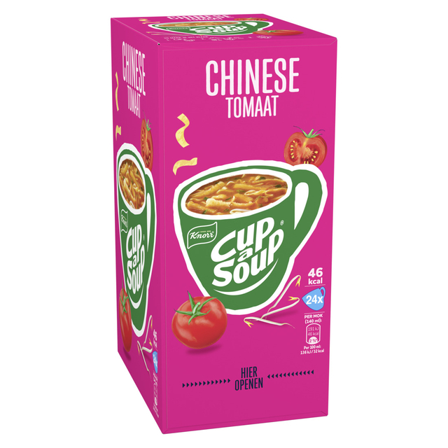 * Heb je zin in een lekker soepje? * Of heb je een drukke dag en zin in een snack om weer scherp en alert door te kunnen? * Dan zit je bij Cup-a-Soup altijd goed! * Zo ook met Cup-a-Soup Chinese Tomaat: een snelle, hartige opkikker die je weer energie geeft om door te gaan! * Deze heerlijke soep is gemaakt met duurzaam geteelde tomaten, en dat proef je! In een verpakking Cup-a-Soup Chinese Tomaat zitten 24 heerlijke zakjes Cup-a-Soup. * Een zakje van deze heerlijke Cup-a-Soup Chinese Tomaat bevat 57 calorieën per mok. * Zoals je van ons gewend bent, besteden wij veel zorg en aandacht aan ons recept en gebruiken wij alleen de beste ingrediënten om de goede smaak te waarborgen. * Daarnaast bevat deze Cup-a-Soup Chinese Tomaat geen kunstmatige kleurstoffen, conserveermiddelen of toegevoegde smaakversterkers. * Deze variant is ook geschikt voor vegetariërs. * De Cup-a-Soup Chinese Tomaat is eenvoudig en snel te bereiden: doe de inhoud van het zakje in jouw favoriete mok en giet er 140 ml kokend water bij. * Daarna eventjes roeren, 1 minuutje wachten en klaar, eet smakelijk! * Zo bereid je binnen een handomdraai een heerlijke mok soep. * Thuis, op kantoor of waar je ook bent, Cup-a-Soup is altijd een heerlijk hartig tussendoortje. * Lekker, makkelijk en snel! 4-uur Cup-a-Soup: BAM! En weer helemaal scherp!