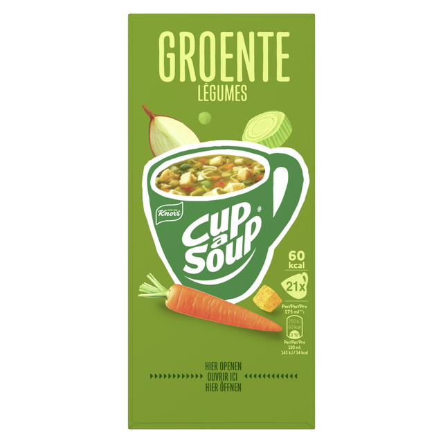 Knorr Cup-a-Soup Groente . * Bevat 21 zakjes voor 21 heerlijke mokken soep . * 60 calorieën per mok . * Zonder toegevoegde smaakversterkers, kunstmatige kleurstoffen en conserveermiddelen . * Geschikt voor veganisten . * Een heerlijk tussendoortje .