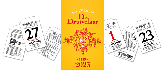 * Dagkalenderblok De Druivelaar. * Al 100 jaar dé Vlaamse scheurkalender. * Met ruim 450 moppen, aangevuld met tal van nuttige rubrieken. * Formaat 106x65mm. * Het karton op de achterzijde kan naar boven gevouwen worden en heeft een gaatje om op te hangen. * Aan het rode metaal aan de bovenzijde zitten ook 2 haakjes om eventueel te bevestigen aan een kartonnen rugschild.