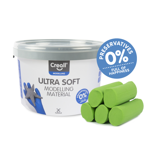 * Creall ultra soft klei is zeer soepel en gemakkelijk kneedbaar boetseermateriaal voor het jonge kind vanaf 2 jaar. * Zijdezacht. * Wordt niet hard, droogt niet uit en is steeds opnieuw te gebruiken. * Ondersteunt de ontwikkeling van de fijne motoriek. * Naast de ontwikkeling van pols en duim gewricht, worden ook de vingers afzonderlijk gestimuleerd. * Wanneer de klei wat stugger aanvoelt verdeel de rollen klei dan in kleine plakken, op deze manier wordt de klei snel zacht en soepel. * Glutenvrij. * In handige emmer om de klei in te bewaren. * Kleur: groen. * Inhoud: 1100 gram.