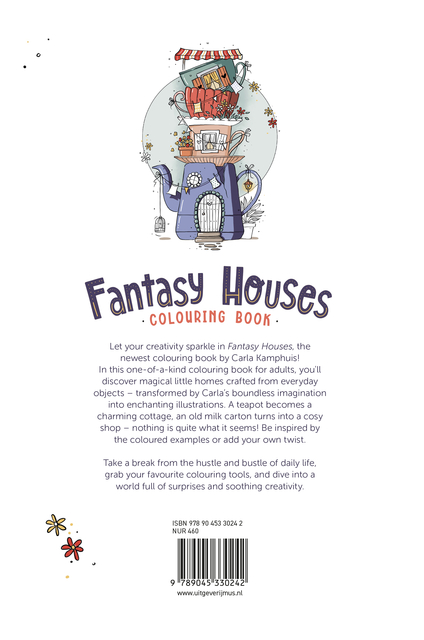In dit unieke kleurboek voor volwassenen ontdek je magische kleine huisjes gemaakt van alledaagse voorwerpen – door Carla’s grenzeloze fantasie omgetoverd tot betoverende illustraties. Een theepot verandert in een charmant huisje, een oud melkpak wordt een knusse winkel – niets is wat het lijkt! Laat je inspireren door de ingekleurde voorbeelden of geef er je eigen draai aan.