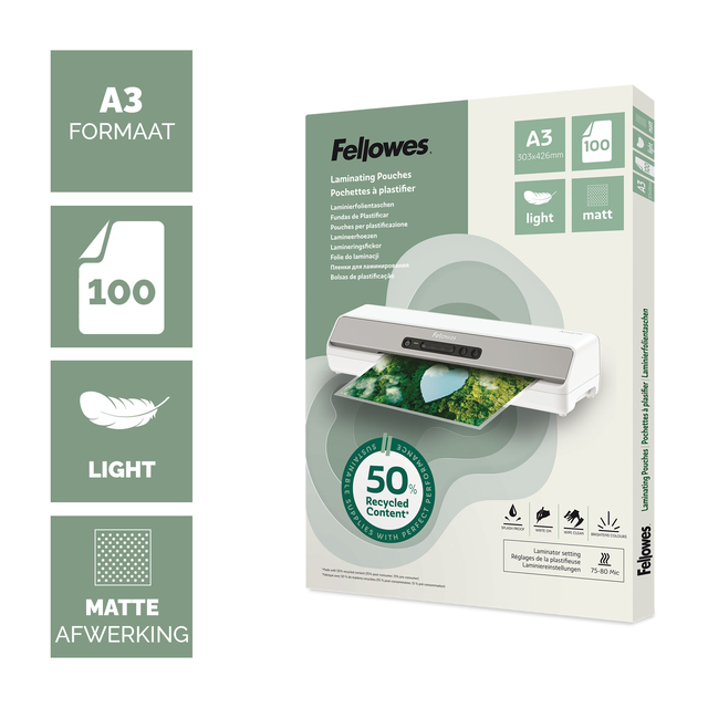 Geef je documenten een nette, professionele uitstraling met deze A3 lamineerhoezen, ontworpen voor dagelijks gebruik en duurzame prestaties. Gemaakt van 50% gerecycled materiaal (minimaal 35% post-consumer, 15% pre-consumer) bieden ze betrouwbare bescherming en ondersteunen ze milieubewuste keuzes. De hoogwaardige matte afwerking zorgt voor veelzijdigheid en visuele aantrekkingskracht, ideaal voor een breed scala aan lamineertaken. Ontworpen voor gebruik op een instelling van 70/80 micron bevat elke hoes een antistatische toevoeging voor soepel en probleemloos gebruik. Verpakt in papiergebaseerde materialen uit duurzame bronnen, inclusief de hoesdrager, tape en buitenverpakking, is deze set van 100 hoezen een slimme keuze voor zowel thuis als op kantoor.