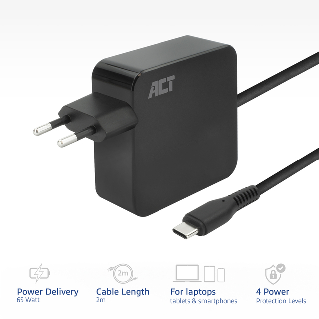 * USB-C laptoplader 65W met Power Delivery-ondersteuning. * Vaste USB-C-kabel met een lengte van 2 meter. * Altijd de juiste hoeveelheid stroom voor je laptop/smartphone/tablet. * 5 Power Delivery-profielen voor het snel en efficiënt laden. * Ondersteunt USB-C laden voor laptops (Dell, HP, Lenovo, Google Pixelbook). * Ondersteunt snel laden voor de laatste generatie Apple MacBook Air M1/M2, iPhones en iPads. * Ondersteunt snel laden voor Android smartphones en tablets. * Viervoudige bescherming: oververhitting, overspanning, overbelasting en kortsluiting. * De AC2010 USB-C Laptoplader 65W is de perfecte oplossing om je laptop via USB-C op te laden. Je laptop wordt altijd opgeladen met de juiste hoeveelheid stroom dankzij de vooraf ingestelde Power Delivery-profielen. Heb je een smartphone/tablet met USB-C? De AC2010 laadt ook je mobiele device met USB-C op. * Altijd de juiste hoeveelheid stroom met Power Delivery-profielen. De AC2010 laadt je laptop op met precies de juiste hoeveelheid stroom dankzij de vijf vooraf ingestelde Power Delivery-profielen. De lader communiceert met je laptop om het juiste profiel te vinden. Hierdoor wordt je laptop op de meest efficiënte manier opgeladen. * Universeel te gebruiken. De AC2010 USB-C laptoplader is te gebruiken met de meest populaire laptopmerken waaronder Dell, Lenovo, Google Pixelbook, Apple MacBook Air M1/M2. * Werkt met zowel Apple en Android smartphones en tablets. Sluit je Android smartphone/tablet of laatste generatie iPhone/iPad aan op de ACT 65W USB-C wandlader aan om je mobiele device te laden. * Lange kabel: 2 meter. De AC2010 is een lader die rechtstreeks in het stopcontact wordt ingestoken. De lader heeft een vaste USB-C-kabel met een lengte van 2 meter. Hierdoor hoef je niet met je notebook naast het stopcontact te blijven zitten. Daarnaast past de AC2010 ook nog eenvoudig in je tas. * 4-voudige bescherming. Veiligheid staat bij ons centraal. Daarom is onze AC2010 USB-C lader uitgerust met bescherming tegen oververhitting, overspanning, overbelasting een kortsluiting.