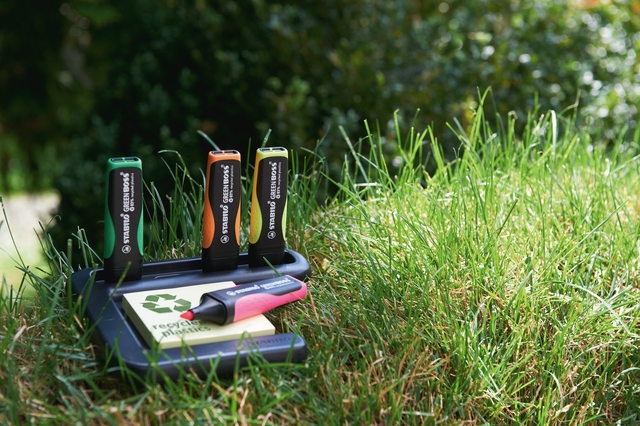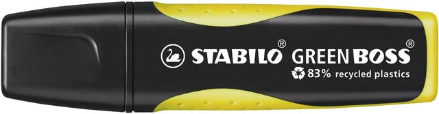 * De high profile highlighter: STABILO Green Boss. * Gemaakt van 83% gerecycled plastic met een milieuvriendelijke inkt. * Fluorescerende markeerstift. * Geschuinde schrijfpunt voor dikke en dunne lijnen. * De transparante kleuren blijven helder. * Door de unieke Anti-Dry-Out technologie kan de Green Boss vier uur zonder dop zonder uit te drogen. * De STABILO Green Boss goed voor ca. 375 meter markeren en eenmaal leeg makkelijk na te vullen met STABILO Boss refills.