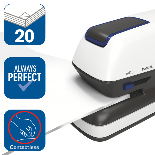 * Elektrische nietmachine kun je moeiteloos tot 20 vel papier tegelijk nieten (80 g/m²), waardoor je thuis of op het werk tijd bespaart. Het kan handmatig worden bediend (door op de voorkant te drukken), of volledig automatisch omdat de nietmachine detecteert wanneer het papier is geplaatst. Producteigenschappen; * Niet tot 20 vel papier (80 g/m²) tegelijk * Handig en moeiteloos nieten; volledig automatisch of handmatig. * Schakel eenvoudig tussen automatisch en handmatig nieten.* Helpt om het nietje precies te positioneren op het document door middel van de gedrukte lijnen op de machine. *Dubbele voeding via een netadapter (meegeleverd) of 4x AA-batterijen (niet meegeleverd).* Hygiënisch nieten door contactloos gebruik. Je hoeft de machine niet aan te raken. * Ontworpen voor desktop- of handmatig nieten * 5 jaar garantie bij gebruik van Rapid nietjes