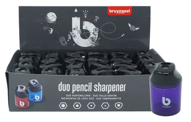 * Een display met 24 duo slijpers van Bruynzeel Teens in verschillende trendy kleuren. * Elke slijper is voorzien van een opvangreservoir en bevat 2 slijpgaten: het grotere gat is bedoeld voor dikke en driekantige kleurpotloden, het kleinere gat is voor grafietpotloden / schrijfpotloden. * Bruynzeel Teens is een speciaal ontwikkelde lijn voor de scholier en de student. * Het is een compleet assortiment met alle teken-, kleur- en schrijfproducten die nodig zijn tijdens de les. * Van kleurpotlood en passer tot viltstiften en puntenslijpers. * Alle Teens producten passen makkelijk in de rugtas.