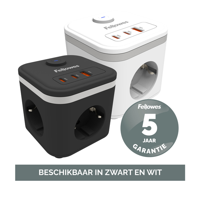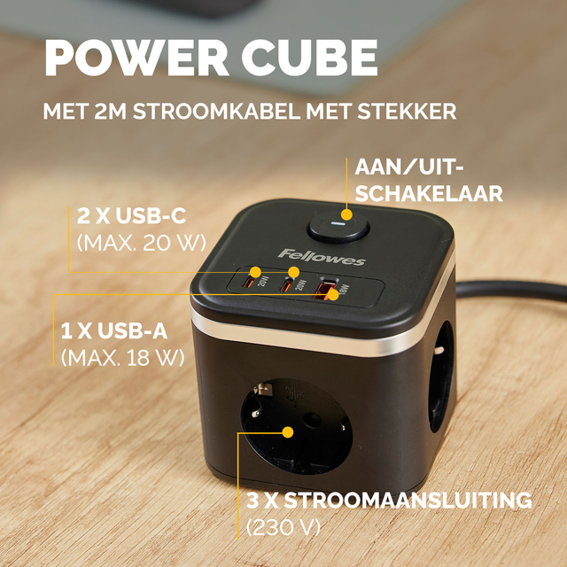 Stekkerblok Fellowes Power Cube F 3vdg 1xUSB A 2xUSB C 2 meter zwart