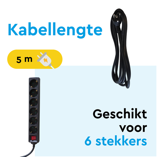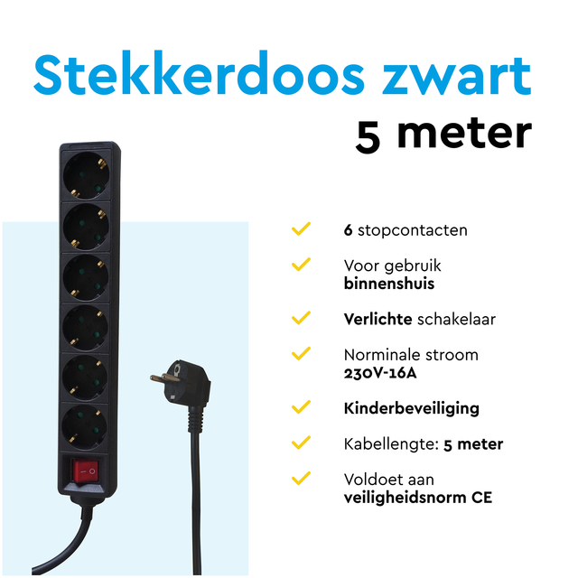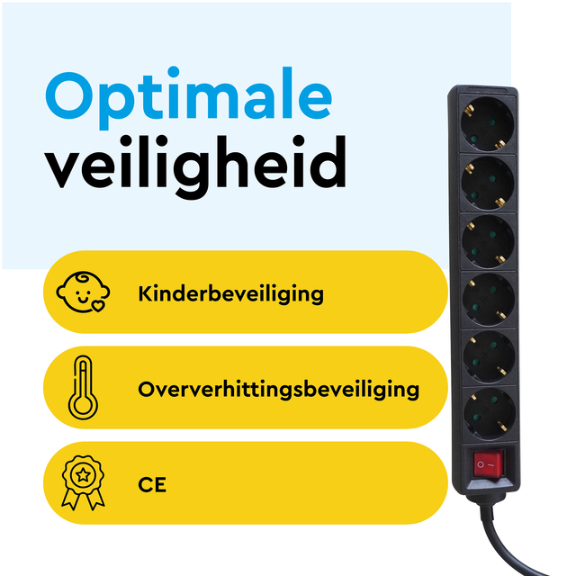 De stekkerdoos met schakelaar voldoet aan alle veiligheidseisen die betrekking hebben op dit product. Hij is voorzien van een ROHS, TUV GS en CE certificaat. * De contactpunten zijn voorzien van kinderbeveiliging. Door het gepatenteerde systeem is het niet mogelijk om voorwerpen in de stopcontacten te steken. * Overbelasting van een stekkerdoos kan leiden tot oververhitting en zelfs brandgevaar. Daarom is het cruciaal om te weten wat het maximale vermogen is dat de stekkerdoos aankan en deze limiet niet te overschrijden. * De zekering of overspanningsbeveiliging die de aangesloten apparaten beschermt tegen piekspanningen en kortsluitingen. * Bovendien is het belangrijk om stekkerdozen regelmatig te controleren op tekenen van slijtage, beschadiging of loszittende onderdelen. * Specificaties: * Capaciteit: 6 stekkers * Voeding: Netstroom