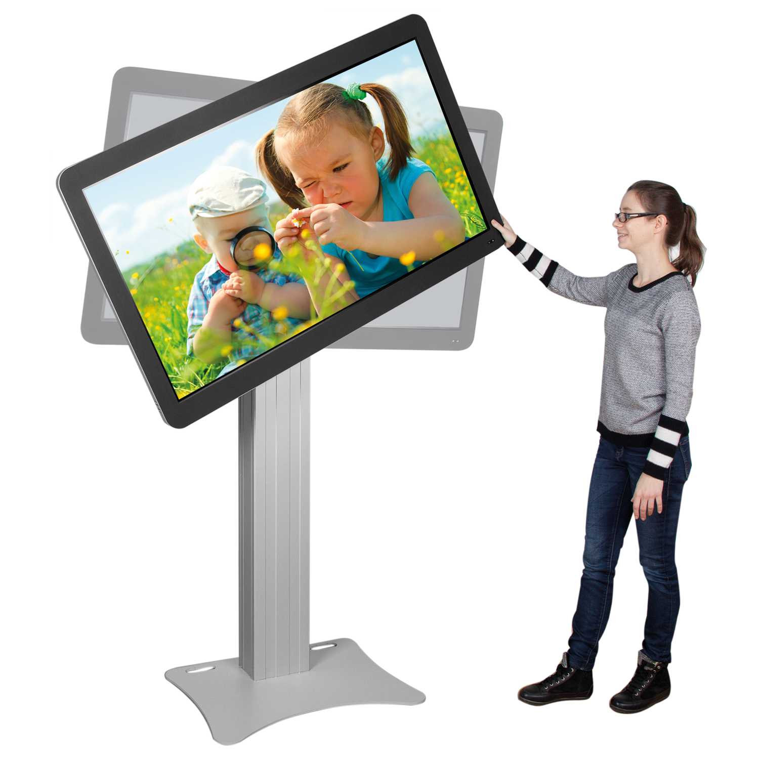 Digital signage oplossing - monitorstandaard voor gebruik met narrowcasting monitoren met een schermgrootte van 42 - 100 inch. De monitorstandaard is voorzien van een aluminium middenkolom met een vaste hoogte. Boven de middenkolom bevindt zich een displayhouder voor narrowcasting monitoren, waarop uw digitale reclame wordt weergegeven. Schakel eenvoudig en snel tussen liggend en staand formaat door simpelweg het display te draaien.