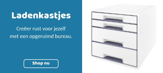 Reguliere kantoorartikelen als een perforator, nietmachine, pennen etc. heb je niet de hele dag nodig, dus die kun je laten verdwijnen in een ladenblok of kast. Daarin kun je bijvoorbeeld ook de documenten bewaren waar je op dit moment mee bezig bent, zodat je ze altijd onder handbereik hebt.