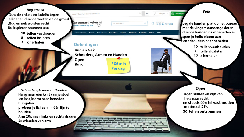 Terwijl je op je bureaustoel zit, kun je deze makkelijke oefeningen doen voor je rug, nek, buik, schouders, armen, handen en ogen. Hierdoor voel je je tijdens en na je werkdag een stuk fitter.